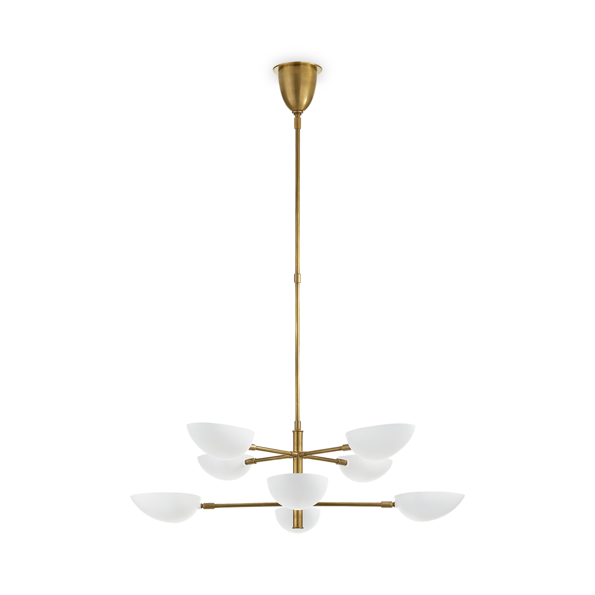 Two tiers of matte white shades project from a hand-rubbed antique brass frame, forming this modern elegant chandelier.